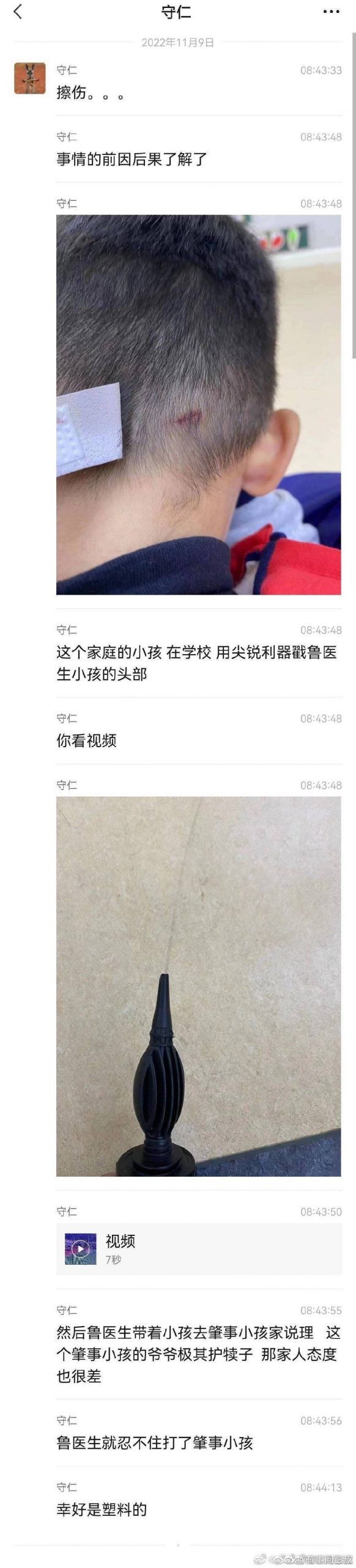 因當天上午其兒子在幼兒園與同班男童爭搶玩具時被對方戳破頭皮,魯?shù)綄Ψ郊抑杏懸f法。